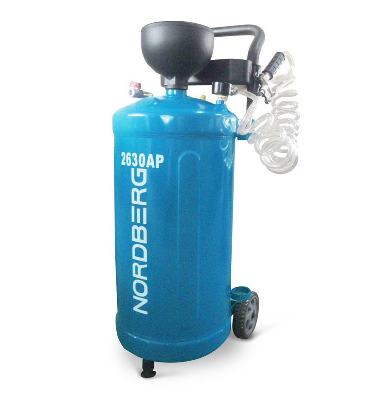 Nordberg 2630AP представляет собой стальную емкость объемом 30 литров на колесах для удобства перемещения в помещении автосервиса, оборудованную шлангом с маслораздаточным пистолетом и шаровым краном для подключения внешнего источника воздушного давления. Для заправки в бак необходимого масла используется пластиковая воронка.