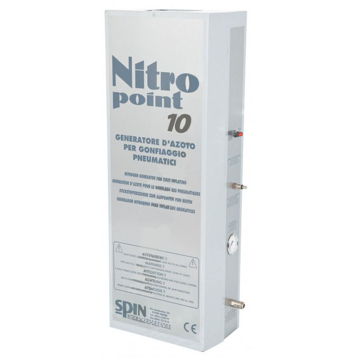 Генератор азота Spin Nitropoint 10 для накачки колес грузовых автомобилей. Производительность 10000 л/час при давлении 10 бар, 12000 л/час при давлении 12,5 бар. Чистота азота 95%. В комплекте с пистолетом для накачки/выкачивания. Без ресивера.