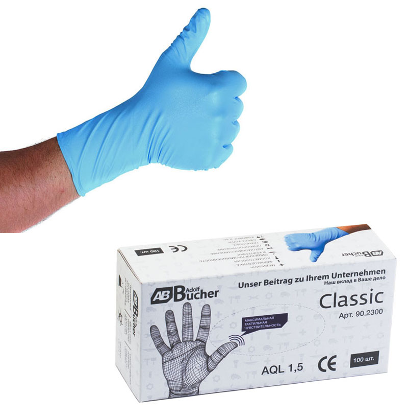 Одноразовые нитриловые перчатки Adolf Bucher Classic, без силикона и талька, не стерильные. Универсальные перчатки с идеальным сочетанием цена/качество. Идеальны для малярных работ, устойчивы к растворителям.